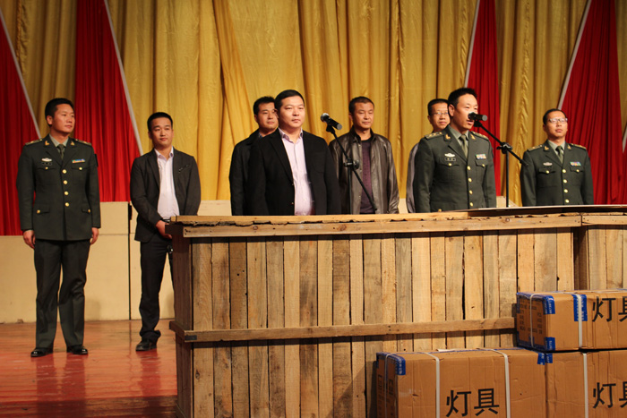 图为晶全照明总经理柯青峰(左三)、副总经理王臣(左二)、宁夏军区政治处主任(右二)为宁夏军区官兵赠送物资。