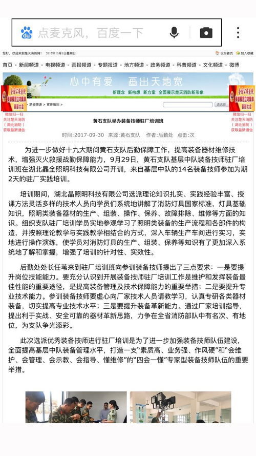 9月28日至9月29日市消防支队基层中队装备技师一行14人来晶全照明工厂进行驻厂培训,并圆满地完成了培训计划。培训经过已刊登在湖北楚天消防网,充分肯定了消防官兵的培训成果,同时也证明了实践培训的重要性。