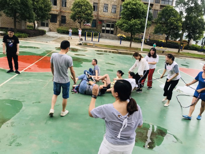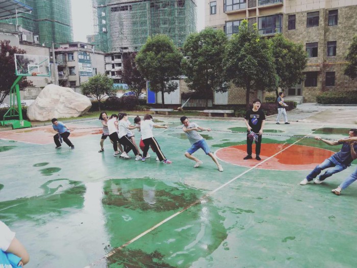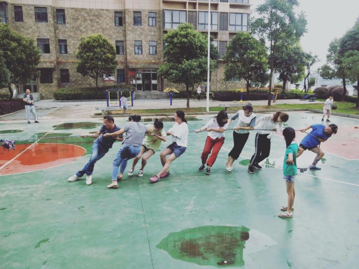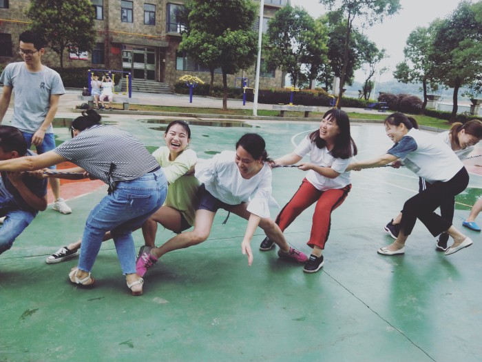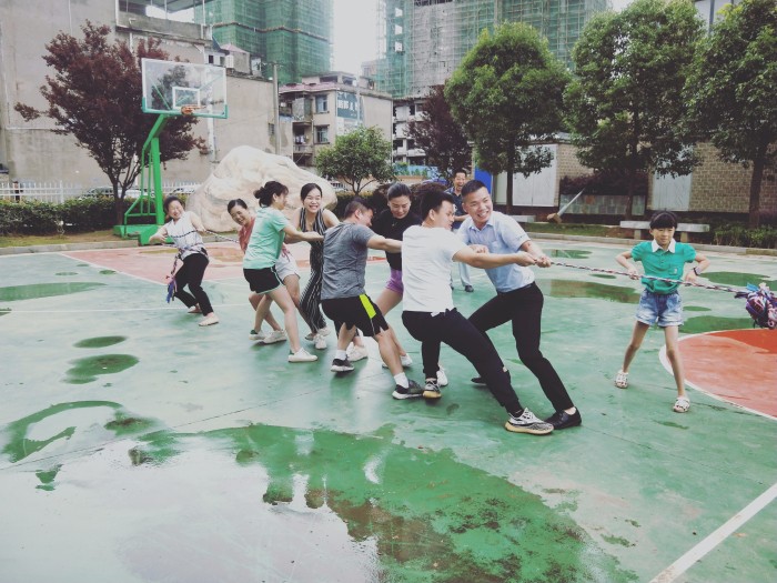这次拔河比赛相当激烈,每组8人,大家都团结一致卯足了劲将绳子拉向自己一方!